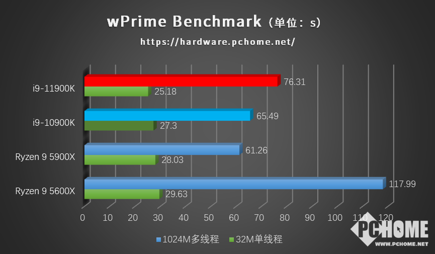 wPrime Benchmark是一款通过算质数来测试计算机运算能力等的软件,与Super Pi只能支持单线程不同的是,wPrime可以完美支持64及以上线程,测试多核心处理器更加合适。在wPrime 32M单线程性能测试中,i9-11900K用时25.18秒,相比i9-10900K的27.3秒明显加快,但多线程计算1024M用时76.31秒,相比i9-10900K的65.495秒慢了不少,少了两颗核心的劣势体现的也很明显。与Ryzen 9 5900X的对比结果也类似,单核性能明显更强,多线程测试由于核心数量少处于下风。