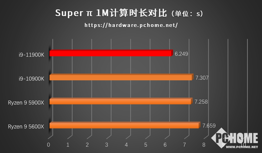 在该项测试中,我们选择1M,也就是计算圆周率小数点后面100万位数字来进行测试,实际完成时间为6.249s(以数据输出完成时间为准)。作为对比,i9-10900K的成绩为7.307s,Ryzen 9 5900X的成绩为7.258s,Ryzen 5 5600X的成绩为7.659s,十一代酷睿的强劲单核心性能有所体现。