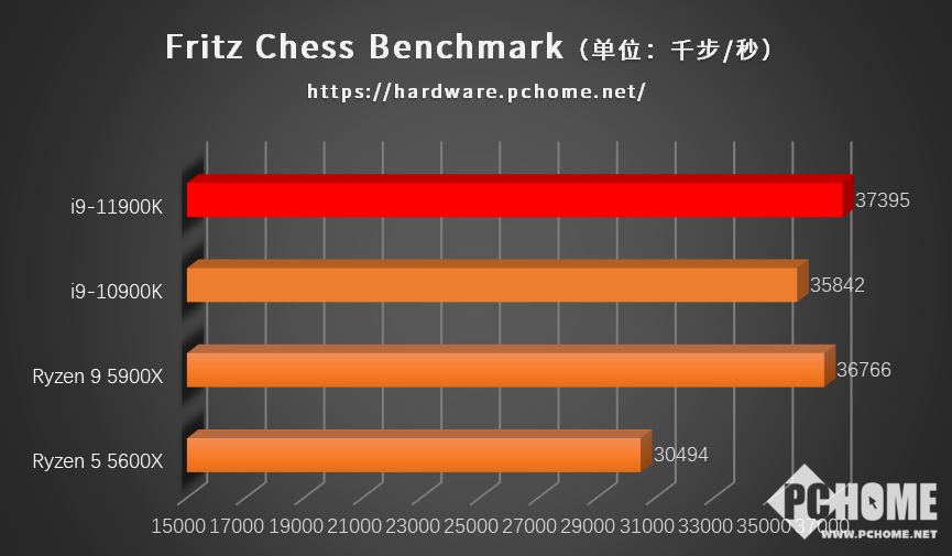 Fritz Chess Benchmark是一款国际象棋测试软件,软件的基准参数是:在P3 1.0G的处理器下,其可以每秒运算480千步。目前国际象棋最多支持16线程,因此刚好可以完全以发挥出i9-11900K的实力,实际测试结果为每秒37395千步。作为对比,i9-10900K(也仅能使用16线程测试)的成绩为每秒35842千步,非常直观的体现出了单核性能的提升。作为对比,Ryzen 9 5900X的成绩为每秒36766千步,Ryzen 5 5600X的成绩为每秒30494千步。