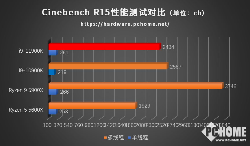 CineBench是业界公认的基准测试软件,首先我们使用CINEBENCH R15版本来测试处理器性能。该项测试中,i9-11900K的单核心分数高达261,相比上代i9-10900K的219cb,提升高达19%,多核心性能为2434cb,相比十核心的i9-10900K稍逊一筹,八颗核心已经发挥出了上代十核94%的性能水平。
