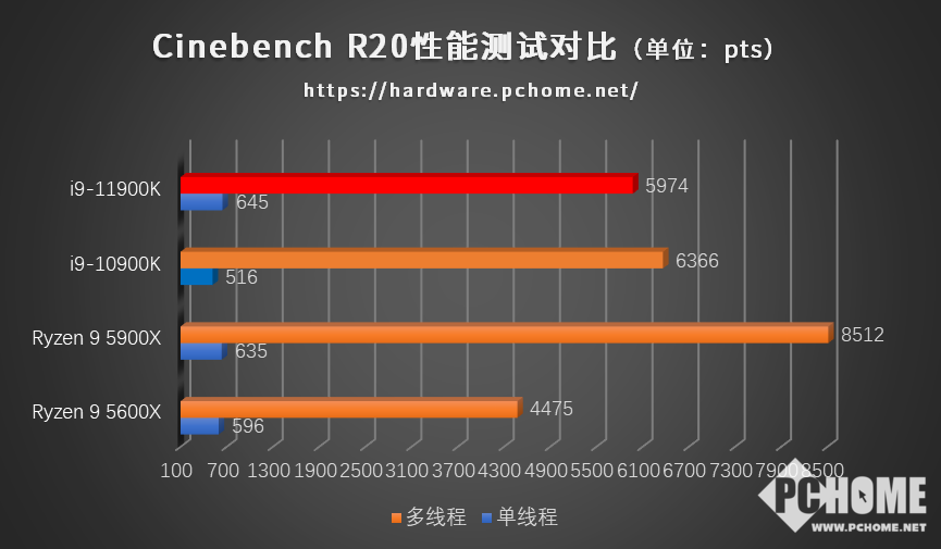 在CINEBENCH R20版本的测试中,i9-11900K的单核心分数高达645pts,相比上代i9-10900K的516pts大幅提升,多核心性能达到了5974pts。作为对比,Ryzen 9 5900X的多核心成绩为8512pts,Ryzen 5 5600X的多核心成绩为4465pts。