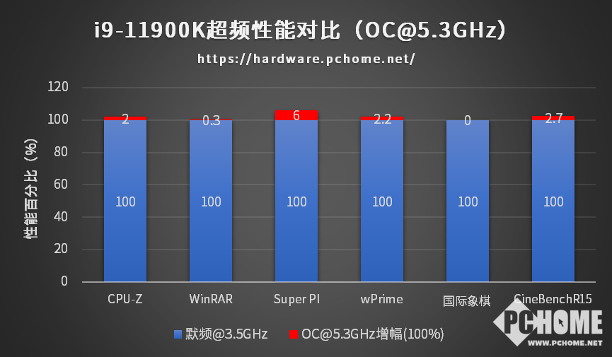 在CPU-Z的基准测试中,如果以i9 10850K为基准,超频后i9-11900K的多核心性能约相当于前者的97%,也就是说8核心基本打平了i9-10850K的十核心。其它基准测试中,WinRAR和国际象棋的测试部分,性能基本没有提升,而在Super PI和wPrime的测试中,超频之后的性能提升相对明显。在Cinebench R15测试部分,i9-11900K超频之后单核心性能基本没有变化,多核心成绩提高了67cb,提升幅度约为2.7%。不过在Cinebench R20的测试部分,超频之后未能通过完整测试,反复尝试均出现了测试中途系统自动重启的情况。
