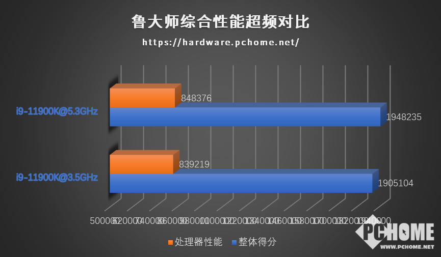 整机综合性能方面,在处理器超频之后,也带来了一定的提升。在鲁大师的综合测评中,整机评分提高了4万多分,处理器性能部分提升了近一万分。