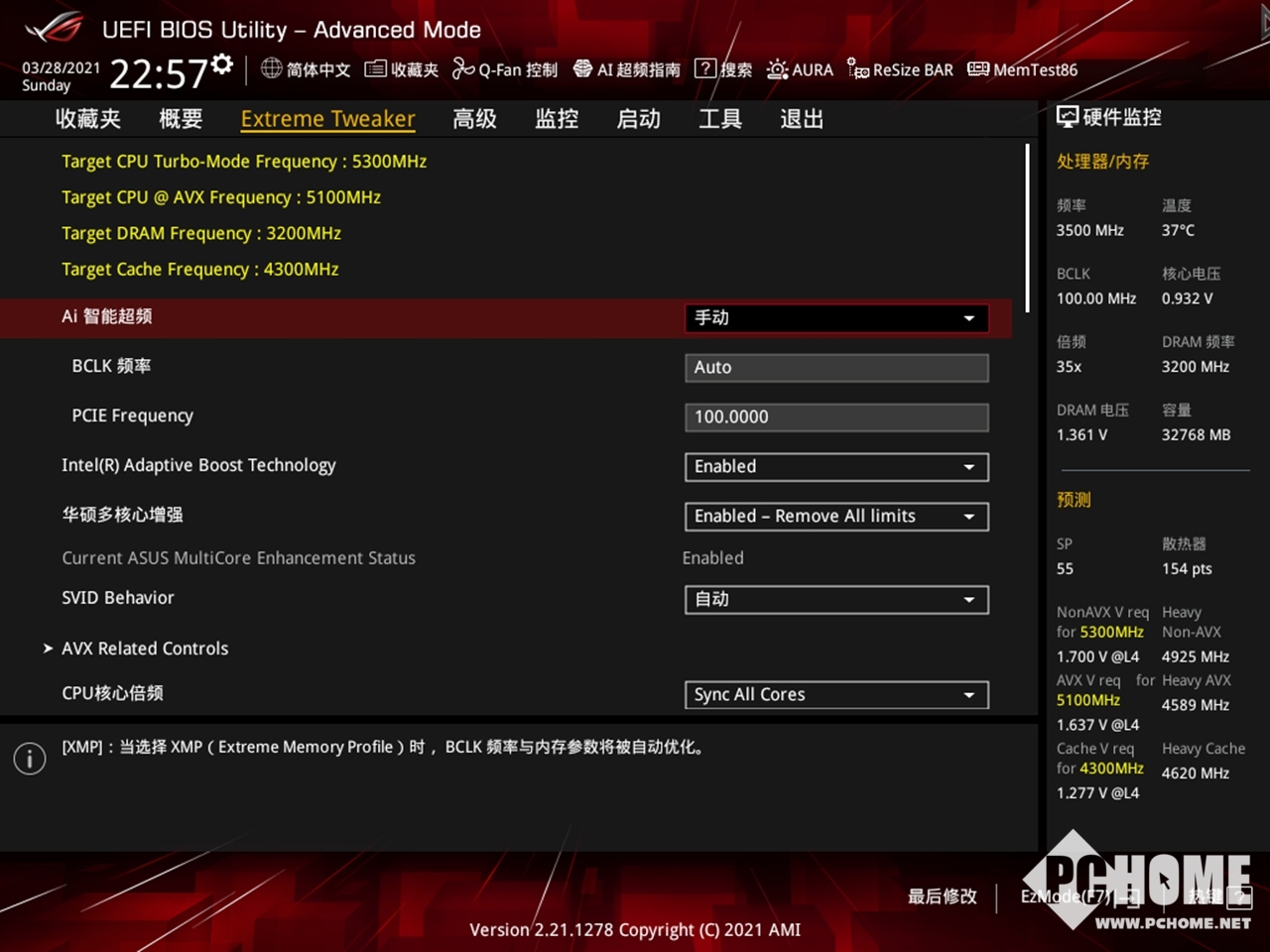 具体到超频环节,我们直接在ROG M13H主板的图形化BIOS内开启ABT功能(不同厂商主板需BIOS更新以支持此功能),然后手动调节CPU倍频与电压等参数,经过尝试,最终成功将酷睿i9-11900K的全部核心超频到了5.3GHz,并顺利通过了大部分基准测试软件的跑分测试。相比默认的频率设置下,手动超频之后,i9-11900K的性能有着一定程度的提升,具体数据如下: