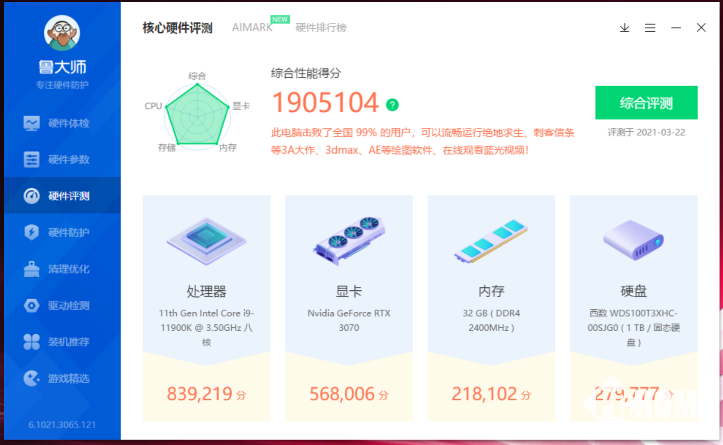整机的综合性能方面,我们首先在系统默认配置下,进行了一些类测试。首先采用鲁大师(版本V6.1021)来进行,实测总体性能评分为190万+,i9-11900K处理器的单项得分高达839219,在处理器排行榜里位列第36位,与Xeon W-3235性能基本相当。作为参考,i9-10900K的此项成绩为63万分,排名第54,i9-11900K的成绩约为其1.3倍。