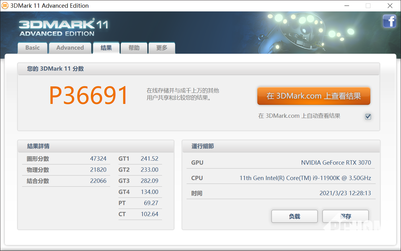 在3DMARK 11 HD分辨率下的Performance(P)模式与FHD分辨率下的Extreme(X)模式下,得分分别为36691和17365分。已经比i9-10900K+RTX 2080Ti组合的分数还要高了。