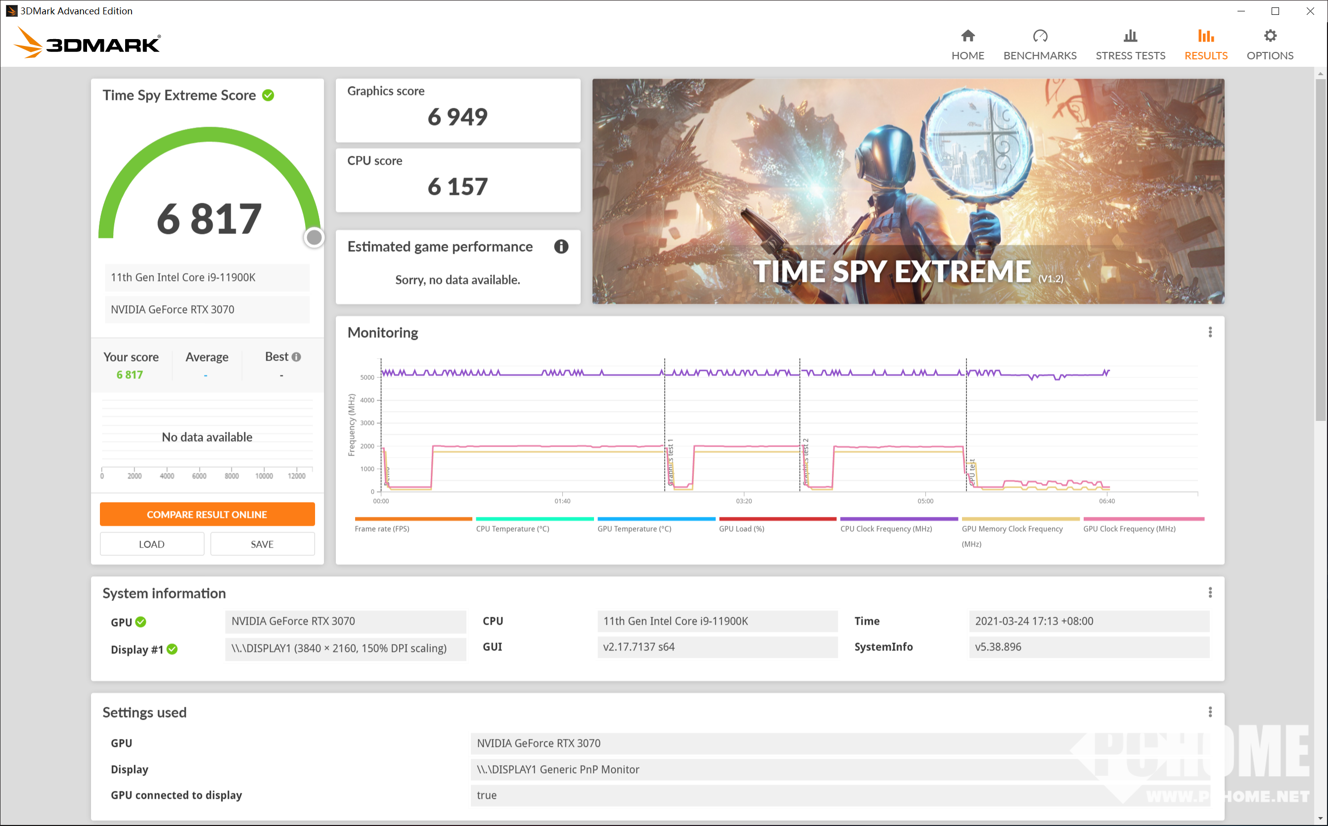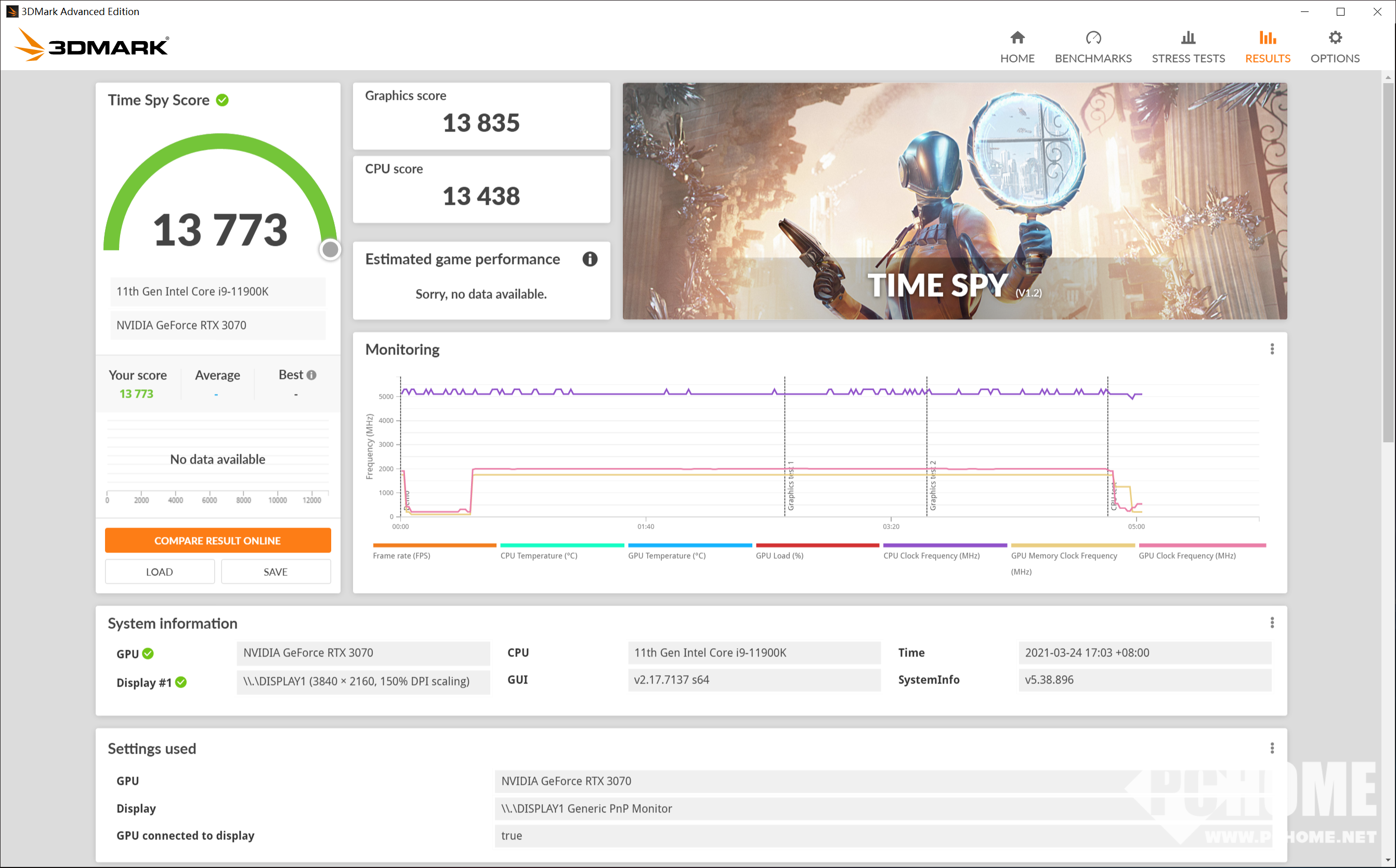 我们分别进行了TimeSpy、TimeSpye Extreme测试,在默认设置下,Time Spy的得分为13773,Time Spy Extreme的得分为6817。