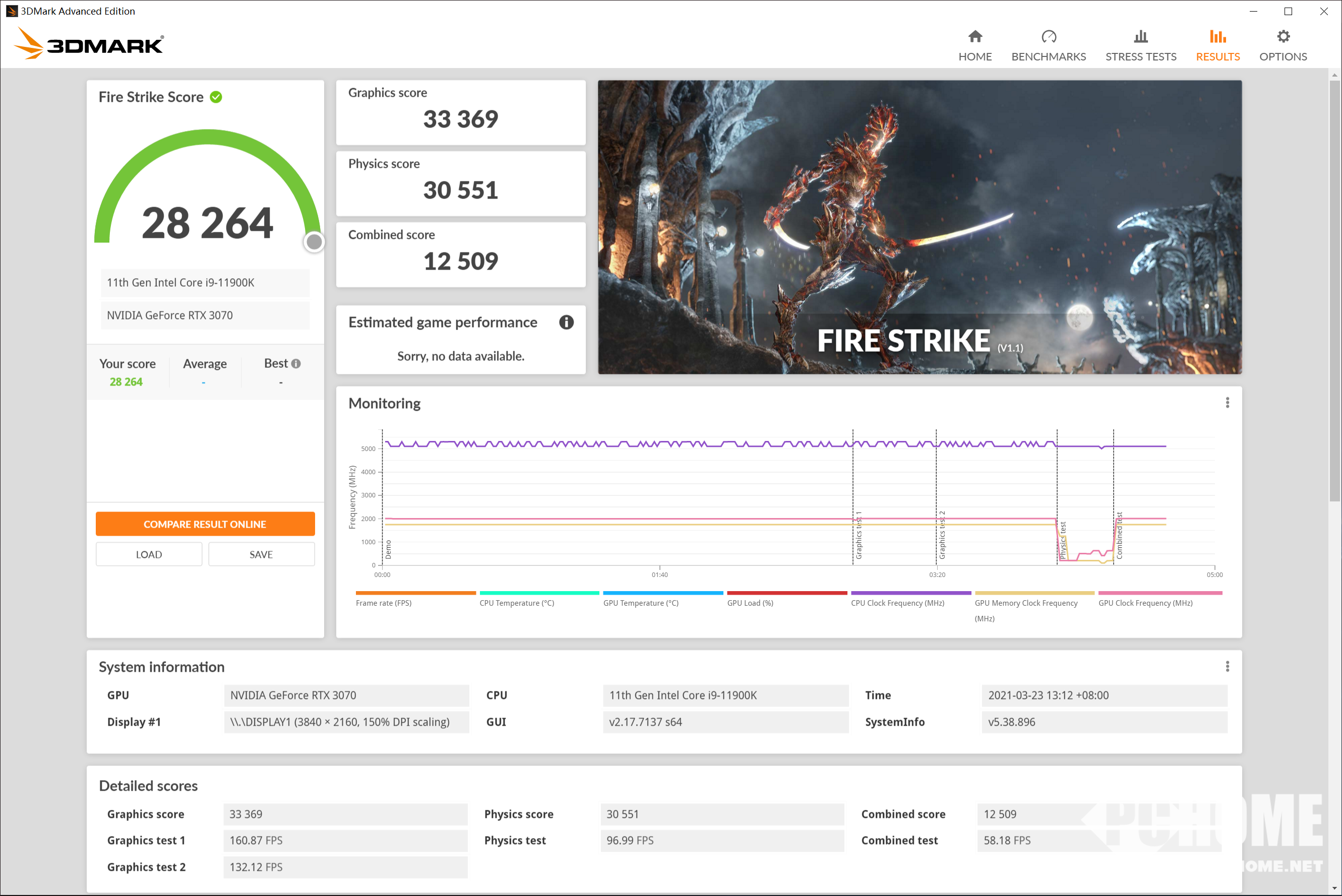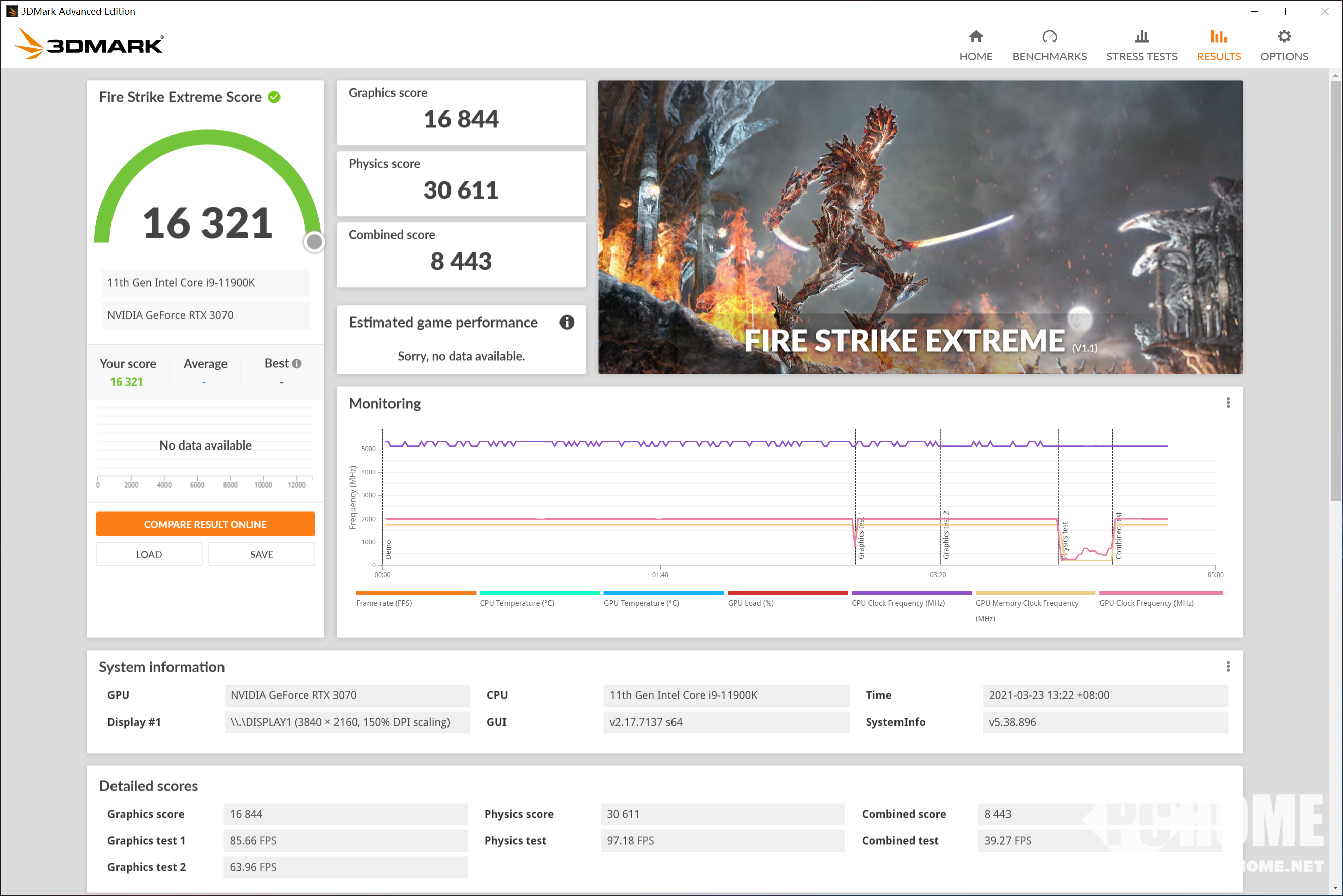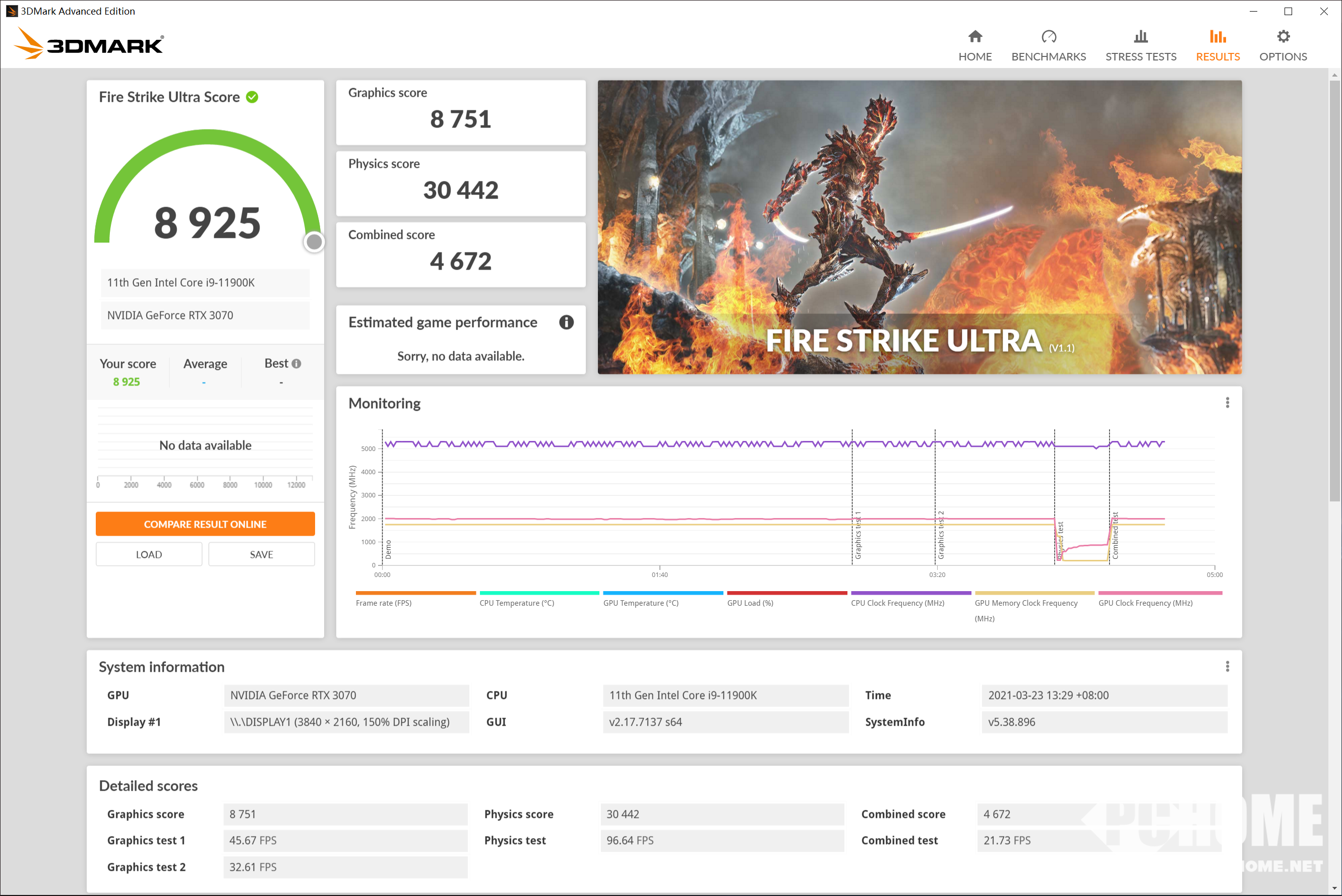 在普通游戏电脑的Fire Strike、针对高性能游戏电脑的Fire Strike Extreme测试、以及针对4K游戏的Fire Strike Ultra三个场景下,得分分别为28264、16321、8925。