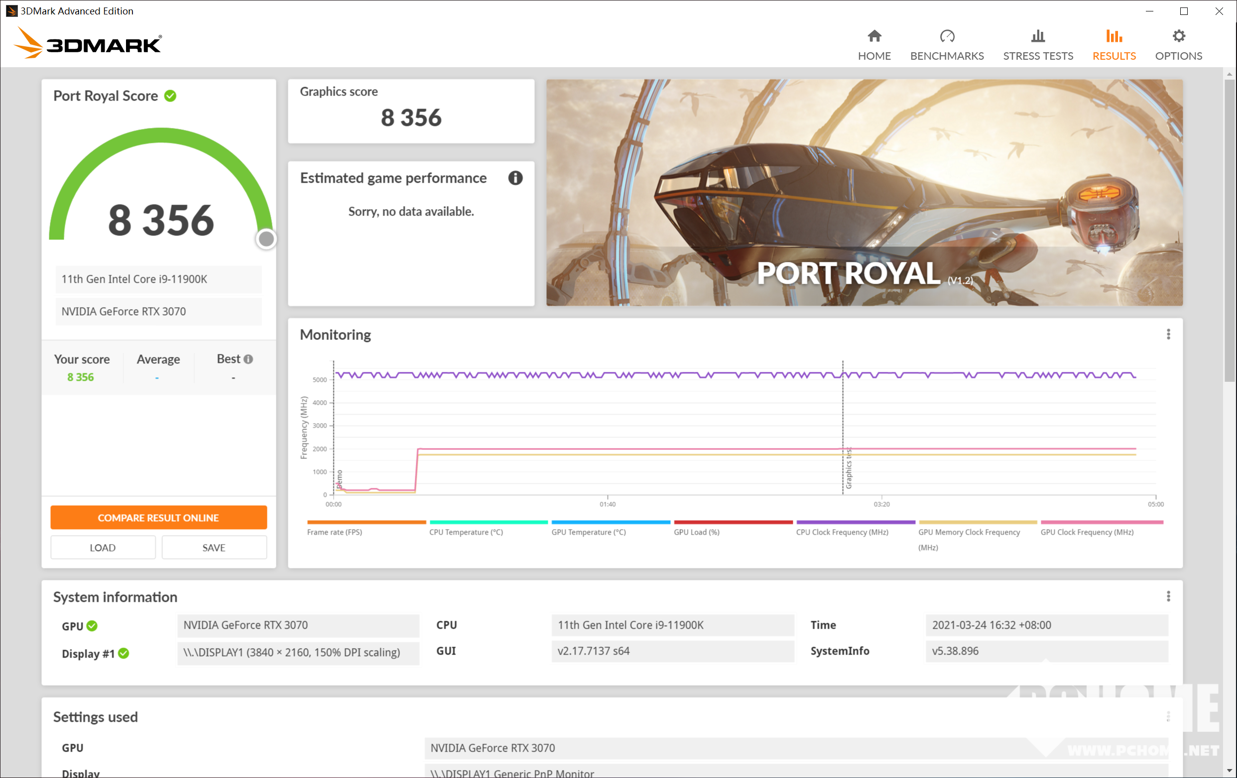 RTX30系列显卡的光线追踪性能有着明显提升,在3DMrk中专门更新的Port Royal测试中,这套平台取得了8356分的好成绩,充分证明了安培架构带来的超强性能表现。