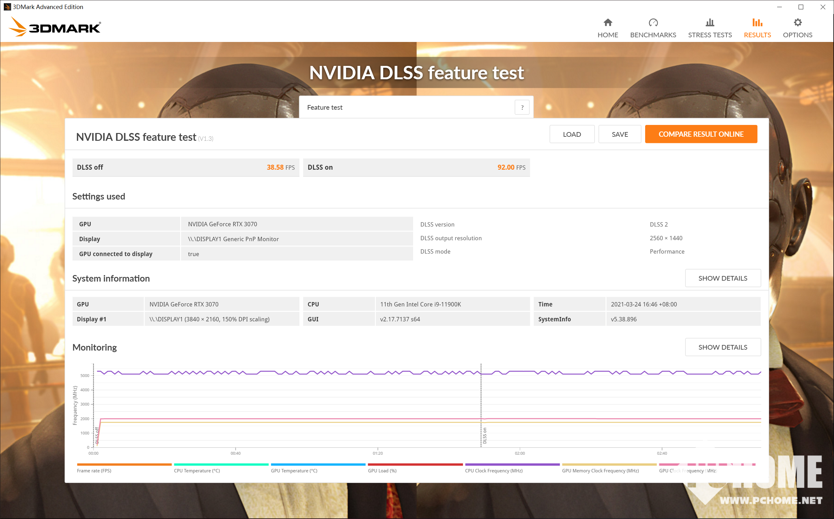 NVIDIA在发布基于图灵架构的RTX20系显卡的时候,引入了一项全新的深度学习超采样抗锯齿技术DLSS ,简单来说,DLSS技术可以通过深度学习,让显卡以更低的负载和渲染分辨率输出4K分辨率抗锯齿的画面,从而大幅度提升显卡在运行4K游戏时的效能。新版3DMark中也针对这一功能推出了专门的测试,在NVIDIA DLSS feature test中,DLSS关闭的情况下,帧率为38.58FPS,DLSS开启之后可以达到92.00FPS,大幅提高了画面的流畅度。RTX 30系列显卡在该项测试中的性能表现比RTX 20系列更加的强势。