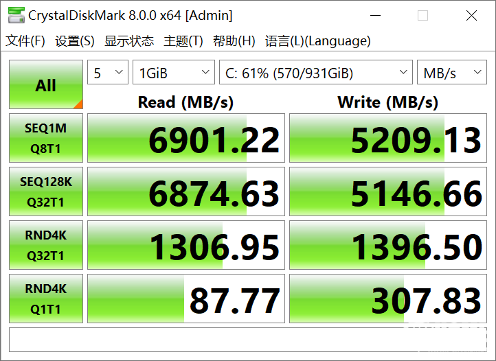硬盘方面,这块来自西部数据的WD_BLACK SN850采用了PCIe 4.0 x4通道,在CrystalDiskMark的测试中,顺序读写速度高达6901 MB/s,读取速度为5209 MB/s,4K随机读写性能也非常出色,单线程下读取速度为87.77 MB/s,4K随机写入速度为307.83MB/s。相比目前主流的PCIe 3.0x4固态硬盘,磁盘读写性能几乎是翻倍的表现,大大加快了系统的响应速度。