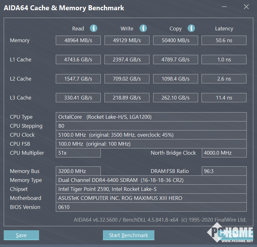 在内存与存储方面,整机使用了32GB内存,在XMP配置下,稳定运行在3200MHz的频率下,在AIDA64 Cache&Memory Benchmark的测试中,内存读取、写入、复制速度分别为48964 MB/s、49129 MB/s、50400MB/s,延迟50.6ns,表现也相当出色。