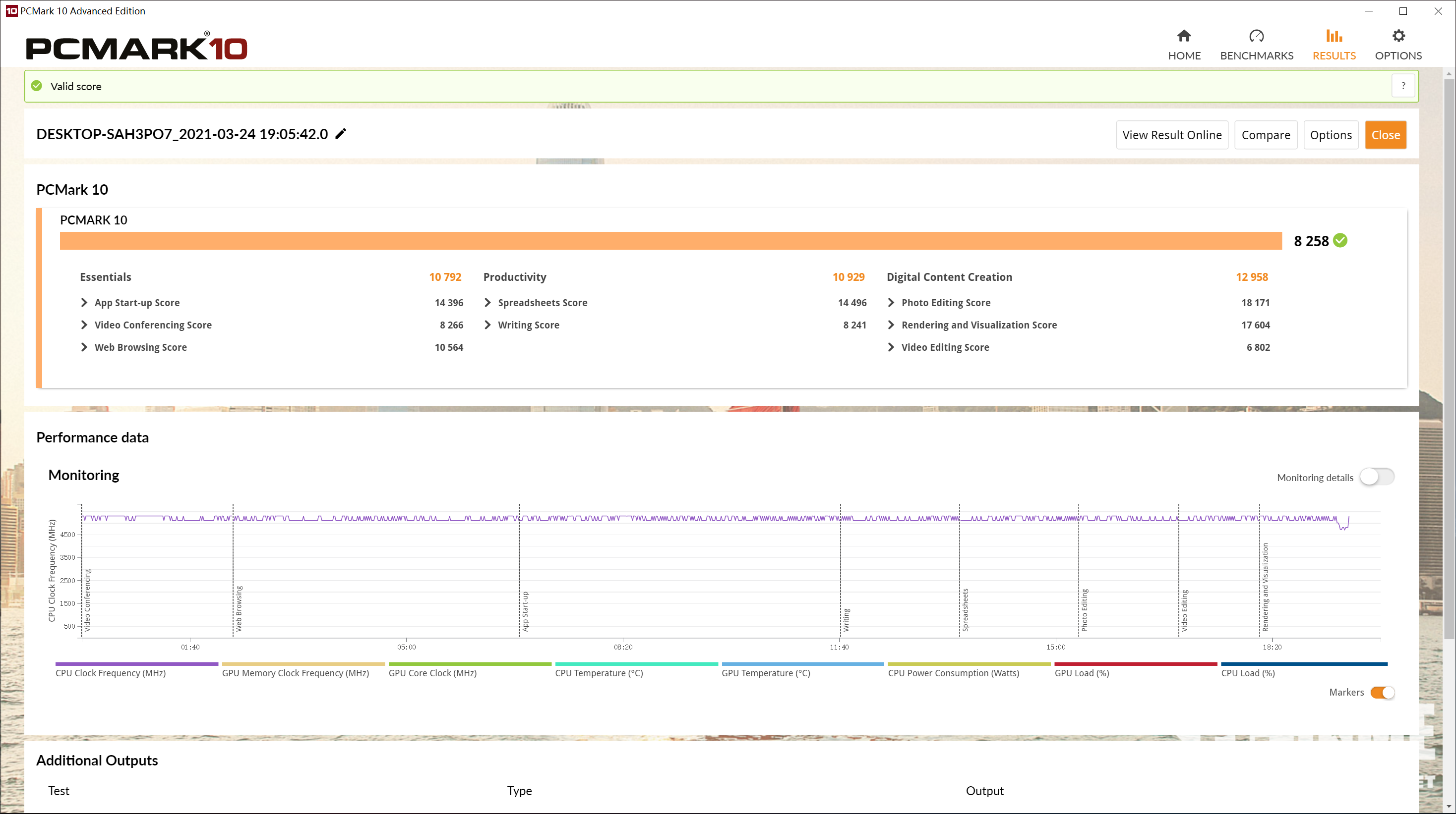 最后,PCMARK作为整机性能的测评软件,十分考验整机软硬件之间的配合、兼容与优化,新版的PCMark 10 针对 Windows 10 操作系统也改善了工作负载,在全面衡量整机性能的标准PCMark 10测试中,整机得分高达8258。