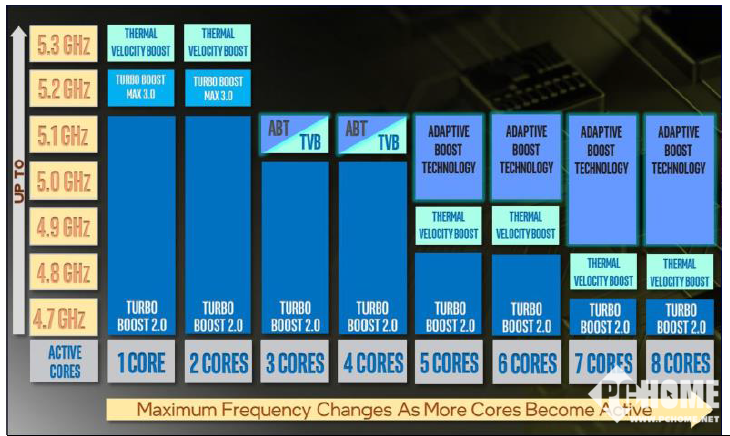 并且,在十一代桌面酷睿中,Intel又引入了一项全新的技术:ABT,也就是英特尔Adaptive Boost Technology技术,这个特性可以适时提高多核睿频频率,进而提升第十一代智能英特尔酷睿i9K和KF台式机处理器的性能。简单来说,在配有增强型电源输出和散热解决方案的系统中,英特尔ABT技术能够进一步提升多核睿频频率,同时仍保持在规范的电流和温度限值内。与过去的英特尔睿频技术一样,英特尔ABT在规范内运行,且不算是超频。如果简要理解的话,可以认为是TVB之上的又一项原生睿频技术,活跃内核数增多时的最大频率也会随之变化,至于能发挥出多少实力,与系统供电、散热能力关系密切。