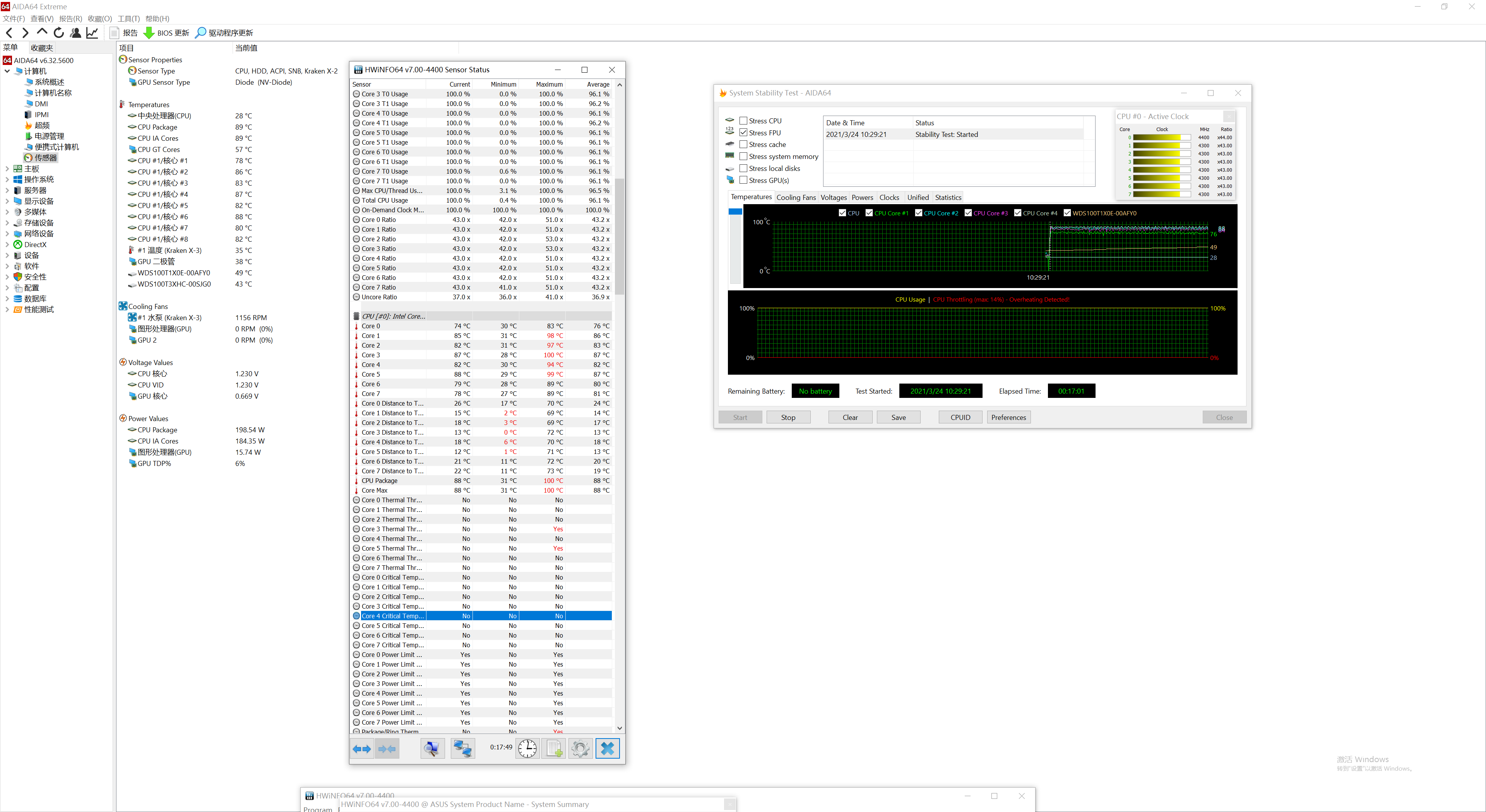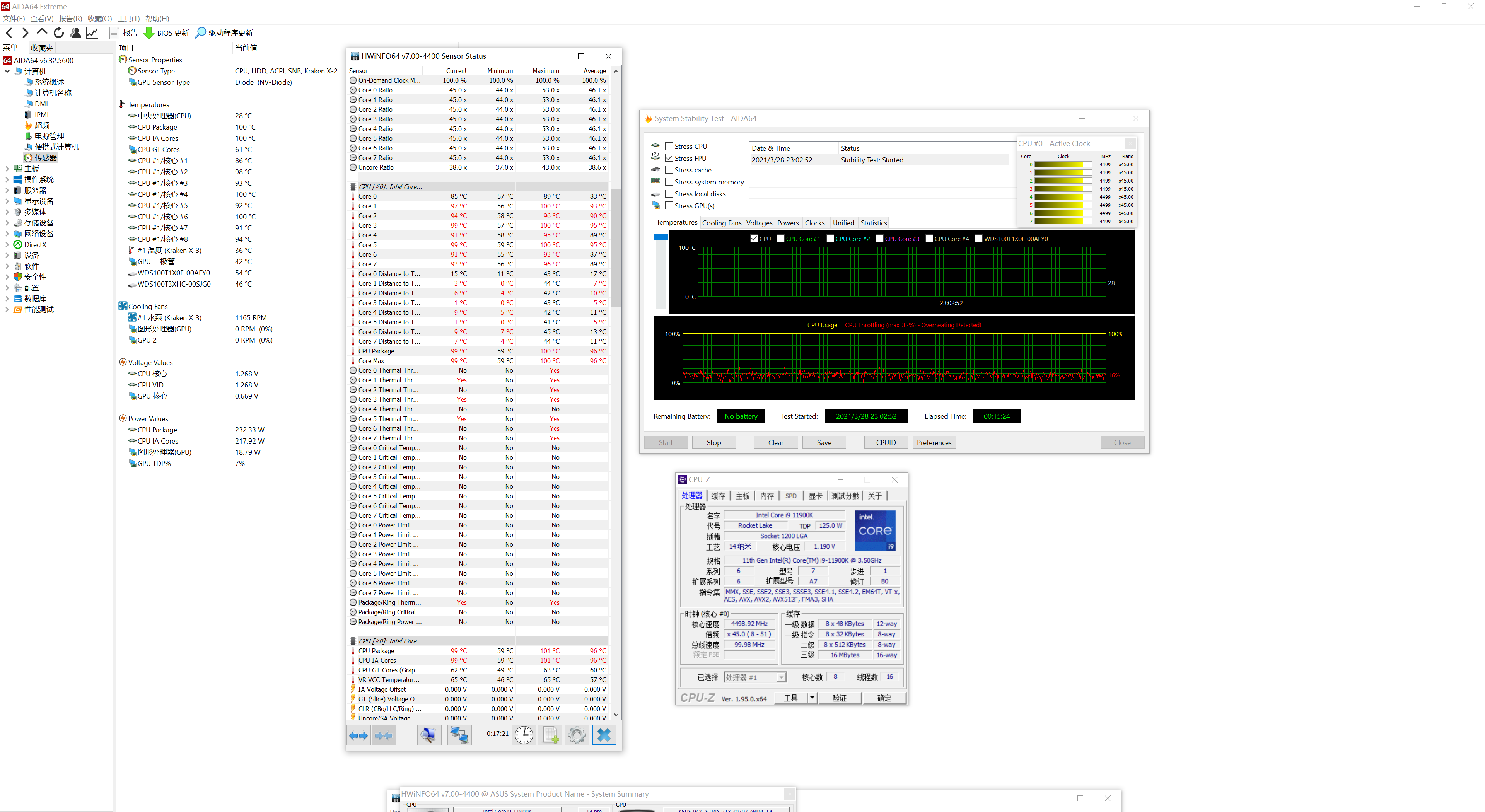 在超频至5.3GHz之后,我们再次使用AIDA 64的稳定性测试(Stress FPU)来进行测试,15分钟后CPU平均温度达到了96°C,单颗核心的最高温度达到了100°C,此时CPU功耗最高达到了233瓦,但8颗核心依然可以维持在4.5GHz的频率下运行。