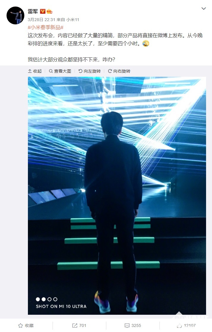 雷军昨晚彩排后再次表示,这次发布会,内容已经做了大量的精简,部分产品将直接在微博上发布。从今晚彩排的进度来看,还是太长了,至少需要四个小时。并且他还有点担心,估计大部分观众都坚持不下来,咋办 ?根据此前卢伟冰的说法,现场观众需要准备纸尿裤了。