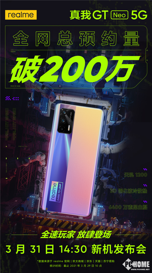 刚才,realme官方发文表示,realme GT Neo全网总预约量突破200万。据悉,realme GT Neo将首发联发科天玑1200,起售价为2K左右。