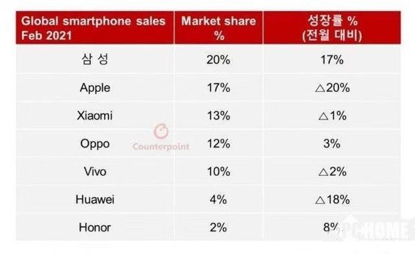 三星依旧是全球市场份额第一的手机品牌,占全球智能手机市场份额的20%。在宣布关闭部分零售店的情况下,苹果手机2月全球市场份额的占比还是达到了17%。