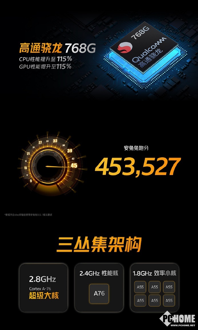 iQOO Z3在竞速性能+120Hz竞速屏与55W闪充所构成的“竞速三连”支持下,在千元级别树立了性能的新标准,让千元用户也能尽享高端性能带来的畅爽体验。iQOO Z3搭载高通骁龙768G处理器、UFS 2.2高速闪存,结合独家的“内存融合”技术,性能表现十分强劲,高达45万分的安兔兔跑分无疑成为千元性能新标杆。