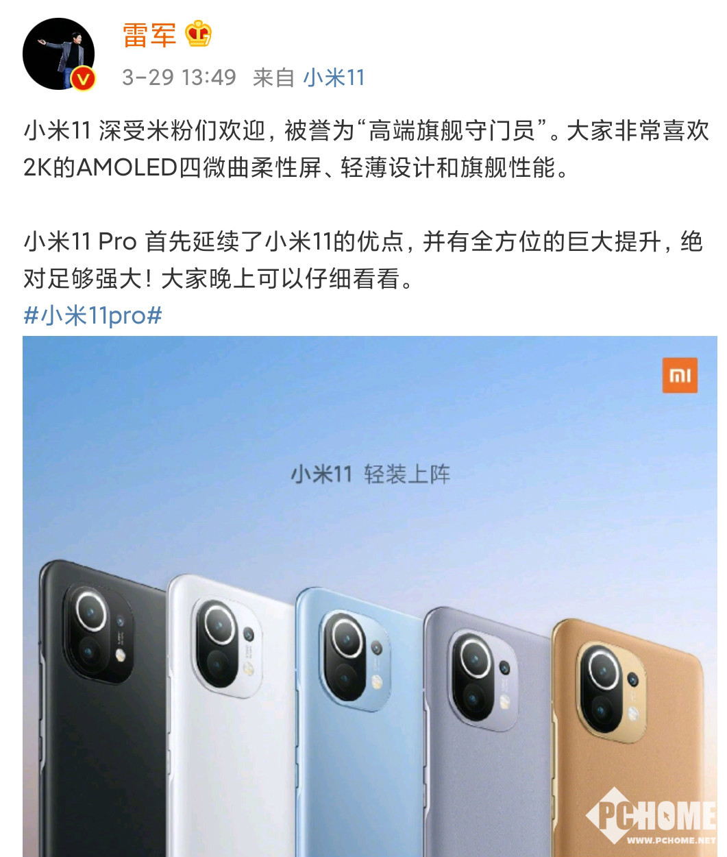 刚刚,小米CEO雷军发文暗示了小米11 Pro的屏幕规格,他透露小米11发布以来深受米粉们欢迎,被誉为“高端旗舰守门员”,大家非常喜欢2K的AMOLED四微曲柔性屏。