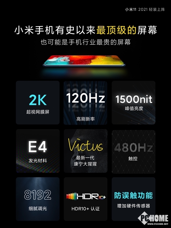 此前小米11上搭载的6.81英寸四曲面屏就被称为“史上最贵屏幕”,拥有3200×1400分辨率,像素密度达到515PPI,支持120Hz刷新率,480HZ触控采样率。