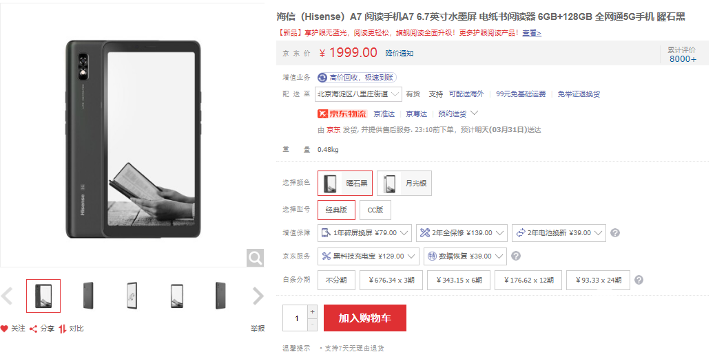 目前海信5G阅读手机A7经典版正在海信京东自营旗舰店售卖中,售价1999元,有曜石黑和月光银两种颜色可以选择。