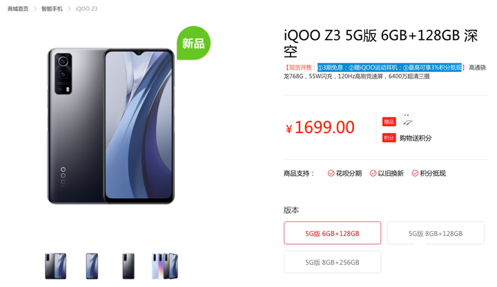 目前,iQOO Z3已于4月1日10:00在vivo官网以及各大电商平台正式发售,6+128GB版本售1699元,8+128GB版本售1799元,8+256GB版本售1999元,iQOO线下各大授权门店、vivo体验店同步开售。用户在官网购机可享3期免息分期、获赠iQOO运动耳机、最高4999元以旧换新补贴、晒单返现30元以及最高3%积分抵现等多重福利。感兴趣的朋友可以前往指定渠道购买。