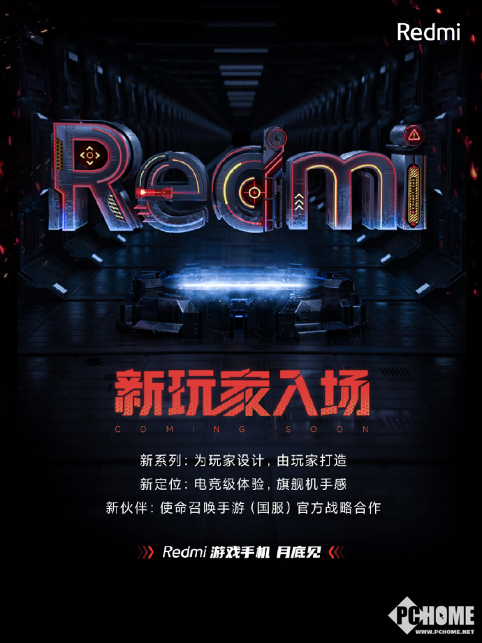 【PChome手机频道资讯报道】Redmi官方今天宣布,将在本月底发布Redmi游戏手机,据Redmi官方透露,这款游戏手机定位旗舰级别,具备硬核游戏功能。Redmi方面希望这部手机能够服务更多玩家,打造游戏旗舰极致性价比。另外这款手机与使命召唤手游(国服)达成战略合作。