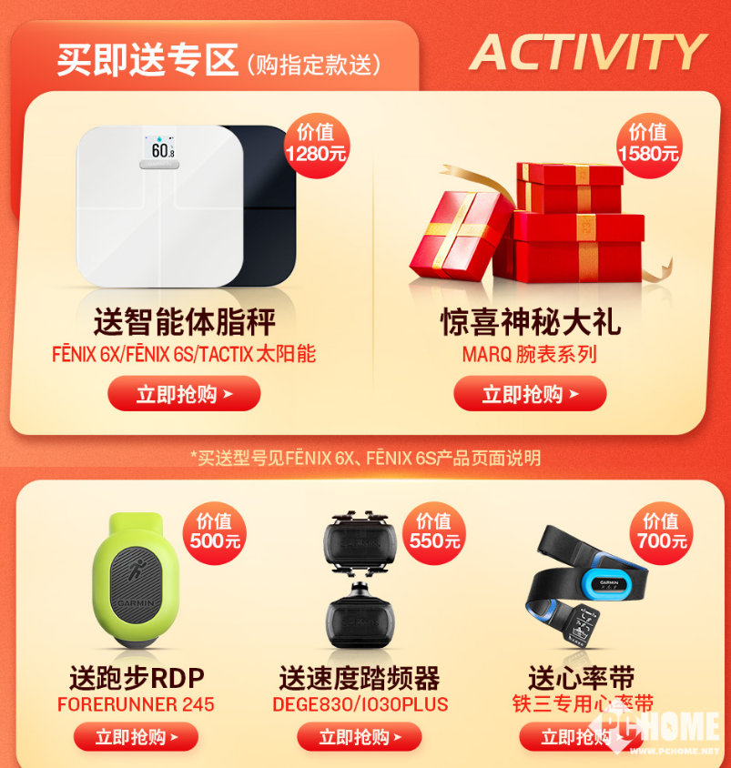 购买Garmin佳明Forerunner 245M手表赠送价值500元的跑步RDP、购买Garmin佳明edge 830/530/520/130 plus自行车GPS骑行多功能码表赠送价值550元的速度踏频器、购买铁三专用心率带赠送价值700元的心率带。