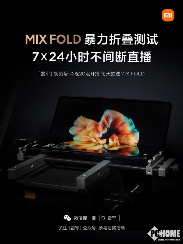 昨日晚间小米11 Ultra刚来了个水下开箱,表示小米成功的实现了IP68防水性能,今日雷军又发文表示,今晚8点,小米会发起一个有点“疯狂”的测试,诚邀大家一起来见证小米MIX FOLD的折叠耐用性,而且是连续7天不间断,这就相当于每1.6秒就要折叠一次。