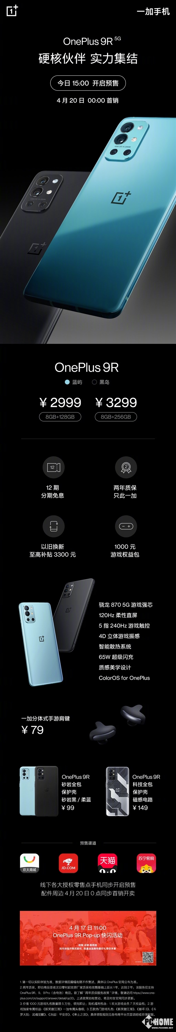 今日下午2点,一加轻旗舰一加9R正式亮相,该机共有蓝屿和黑岛两种配色,而且所搭载的屏幕拥有非常高的可视角度以及通透性,官方表示这块屏幕非常适合游戏党。下面让我们公布一下价格,8+128版本2999元,8+256版本3299元。