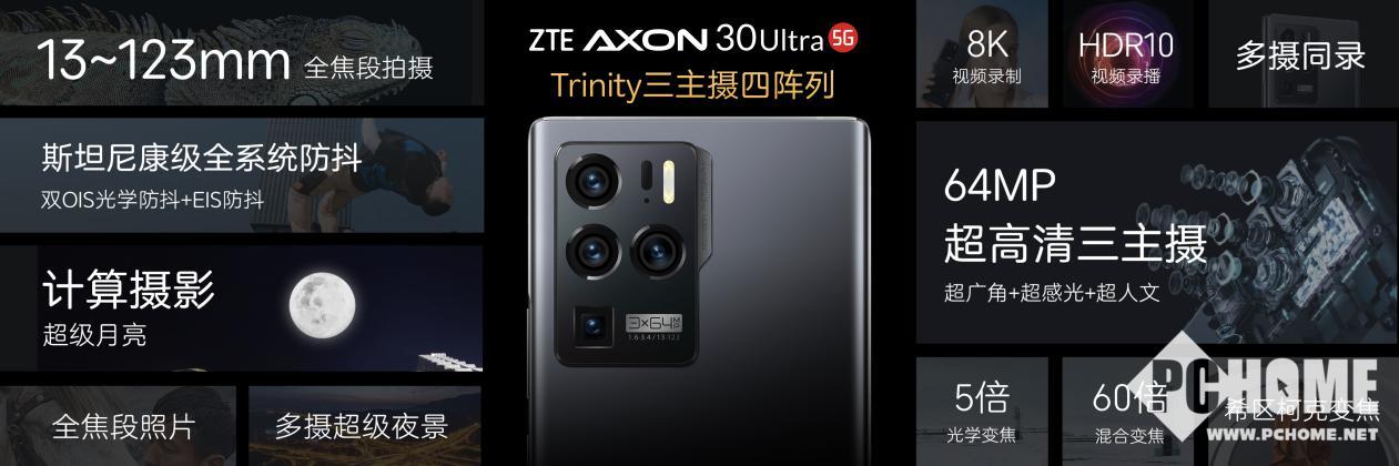 【PChome手机频道资讯报道】4月15日晚,中兴手机在线上举行新品发布会,会上正式推出Axon30系列手机新品——中兴Axon 30 Ultra与中兴Axon 30 Pro。其中最引人关注的就是中兴Axon 30 Ultra,该机后置搭载Trinity三主摄四阵列,包括超感光主摄、超人文主摄、超广角主摄的组合,打造了一套完整的多主摄阵列融合影像系统。