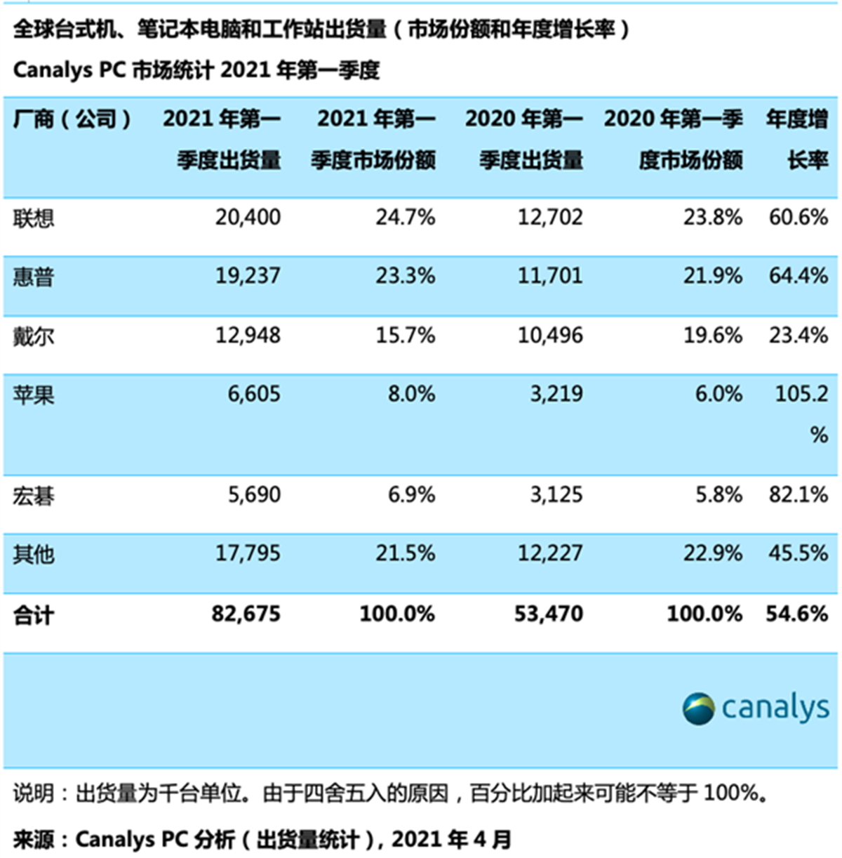 据悉,2020年积压下来的订单是一大驱动因素,不过随着小企业逐渐开始复苏,2021年一季度也有不少新订单。笔记本电脑和移动工作站的出货量年同比猛增79%,达到6780万台。