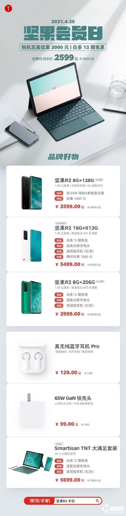 4月20日坚果会员日当天,坚果R2最强旗舰将迎来巨大折扣,8+128GB版本首发价4499元直接跌破三千,到手价2599元,纯白色光阴特别版同样限时优惠1000元,且下单即送65W 氮化镓充电头+运动蓝牙耳机。