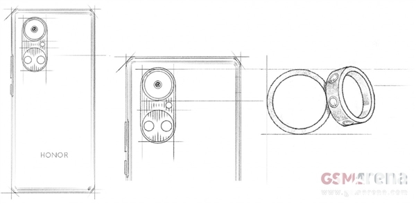 同时,外媒还收到了展示手机背面的设计草图,图中显示该机整体将沿用荣耀V40轻奢版的设计,在机身左上角部分配备一块椭圆形三摄模组,其中还采用了独特的双圆环设计,造型十分独特,这也与此前华为P50系列的渲染图不谋而合。
