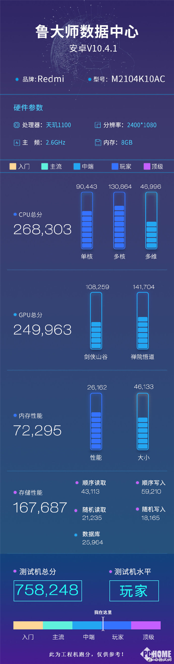 今日,鲁大师曝光了一组疑似Redmi新机的跑分成绩,综合性能跑分758248分。该机的型号为M2104K10AC,极有可能是当下热度非常高的Redmi K40游戏增强版。Redmi游戏手机搭载天玑1100处理器辅以8GB+256GB的存储,分辨率为2400x1080。
