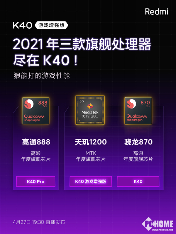 据了解,这三款旗舰芯片分别为,Redmi K40的骁龙870、Redmi K40 Pro的骁龙888,以及将于4月27日发布的K40游戏增强版的天玑1200。