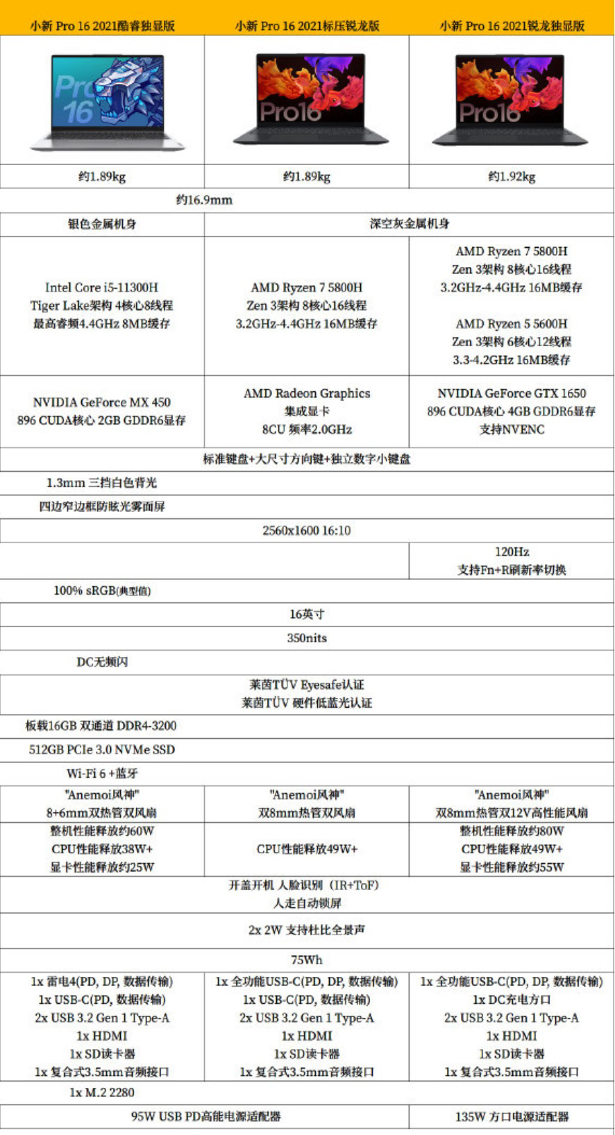 联想小新Pro 16拥有三个版本——酷睿独显版、锐龙核显版和锐龙独显版。其中酷睿独显版搭载i5-11300H处理器和MX 450独显,锐龙核显版搭载R7 5800H处理器。而锐龙独显版则可选R5 5600H和R7 5800H两种配置,显卡是GTX 1650,另外还配备了120Hz刷新率屏幕。
