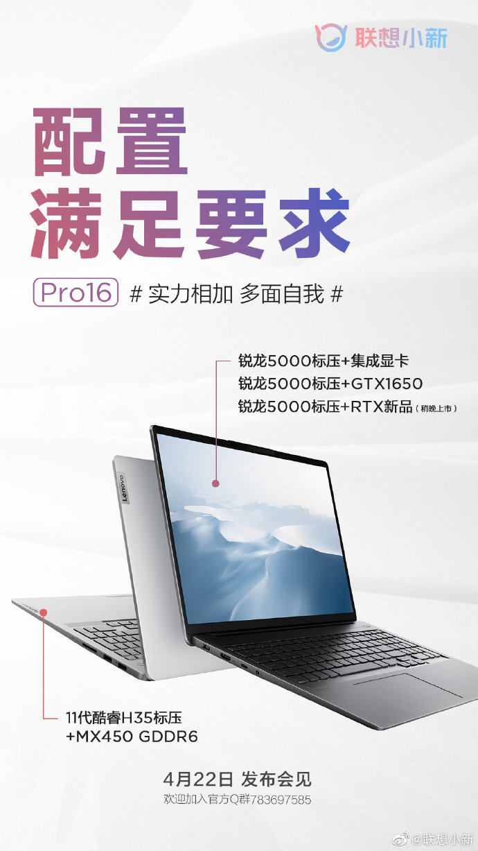 联想春季新品发布会即将召开,本次发布将有5款笔记本和大家见面。其中联想小新Pro 16引人瞩目,这款笔记本拥有酷睿独显版、锐龙核显版和锐龙独显版三个版本,其中锐龙独显版还搭载了120Hz刷新率屏幕。