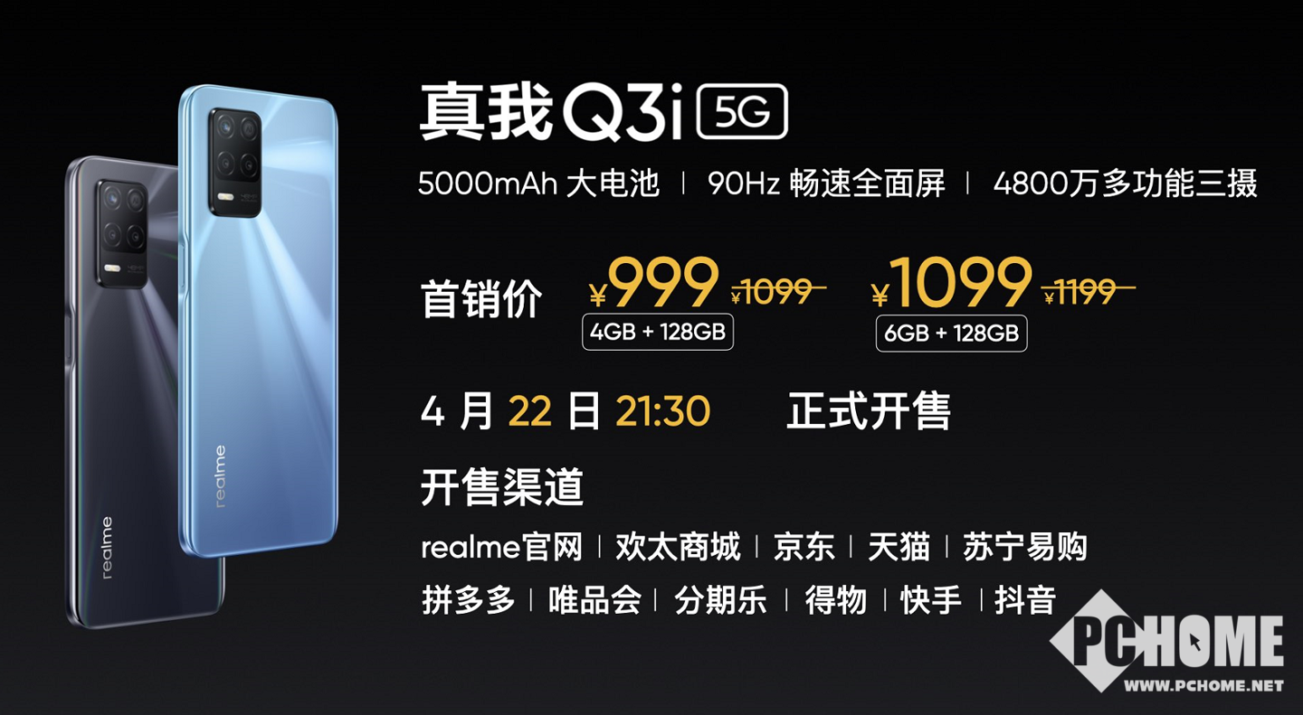 realme Q3系列发布会上除了给我们带来了realme Q3、Q3 Pro,realme 真我 Q3i 也正式亮相,这是一款入门级别的5G手机,该机搭载联发科天玑 700 5G 芯片、5000mAh 大电池,提供粒子灰、光影蓝两款配色,4+128GB 首发售价 999 元,6+128GB 1099 元,将于 4 月 22 日 21:30 正式开售,首发价优惠 100 元。