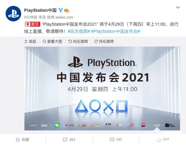 4月23日一早,@PlayStation中国便在微博发布消息称:“ 'PlayStation中国发布会2021' 将于4月29日(下周四)早上11:00,进行线上直播,敬请期待!"