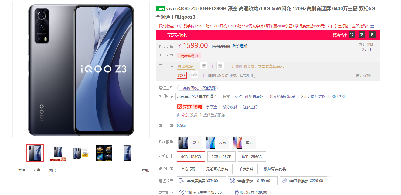 今天笔者为大家推荐一款在性能、功能、价格方面都不错的一款手机——iQOO Z3,其采用120Hz高刷竞速屏,搭载高通骁龙768G处理器,支持55W闪充,拥有6400万超清三摄。目前iQOO Z3正在限时优惠中,其中6GB+128GB可以抢满880-30的优惠券,再加上限时优惠100元,到手价1599元;8GB+128GB以及8GB+256GB可以领取满1000-30元的优惠券,到手价分别为1799元以及1999元。值得注意的是,6GB+128GB版本的秒杀价仅限今天一天。
