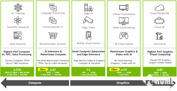 A10 GPU更侧重图像性能,可加速深度学习推理、交互式渲染、计算机辅助设计和云游戏为混合型AI和图形工作负载提供支持。可以应用于AI推理和训练的A30和A10 GPU今年夏天开始会应用于各类服务器中。