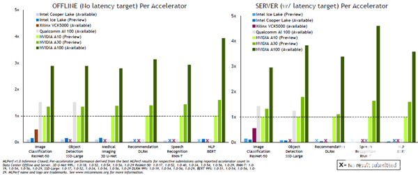 所有主要的OEM都提交了MLPerf测试结果,其中,在AI领域占有优势地位的NVIDIA此次是唯一一家提交了从数据中心到边缘所有MLPerf基准测试类别数据的公司,并且凭借A100 GPU刷新了纪录。