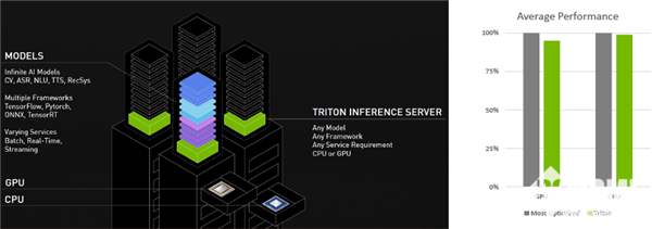 在NVIDIA此次提交的结果中,多项是基于Triton推理服务器,其支持所有主要框架的模型,可在GPU及CPU上运行,还针对批处理、实时和串流传输等不同的查询类型进行了优化,可简化在应用中部署AI的复杂性。