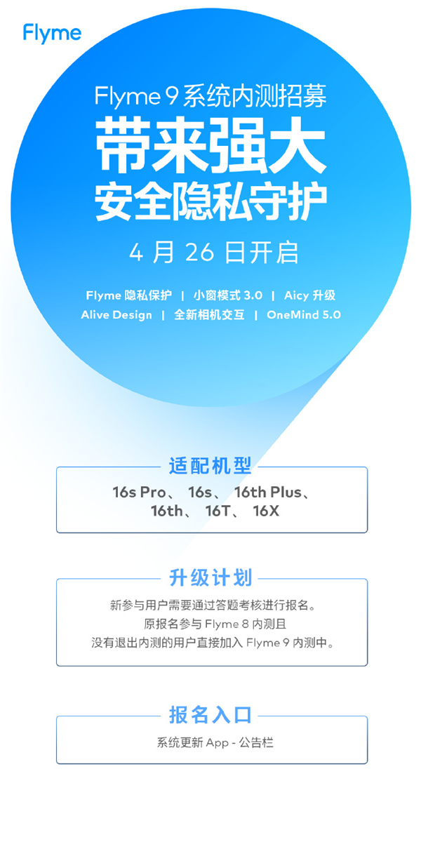今日,Flyme 9系统内测招募正式开启,名额有限,饱满即止,适配的机型包括魅族16s Pro、16s、16th Plus、16th、16T、16X,原报名参与Flyme 8内测且没有退出内测的用户将自动加入,新参与用户需通过答题考核进行报名。
