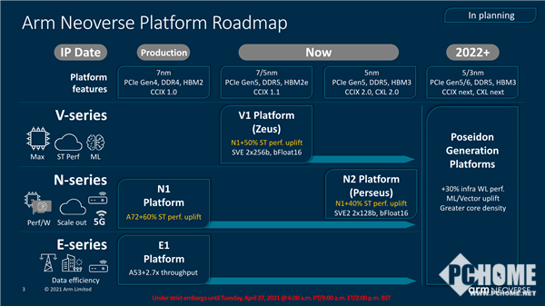 而在强化单核性能的同时,V1平台也支持强大的多核心扩展,最多可以做到96核心96线程,工艺上可以使用7nm、5nm,还支持DDR5内存、PCIe 5.0总线、HBM2e高带宽内存、CCIX 1.1互连标准等。
