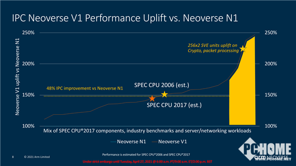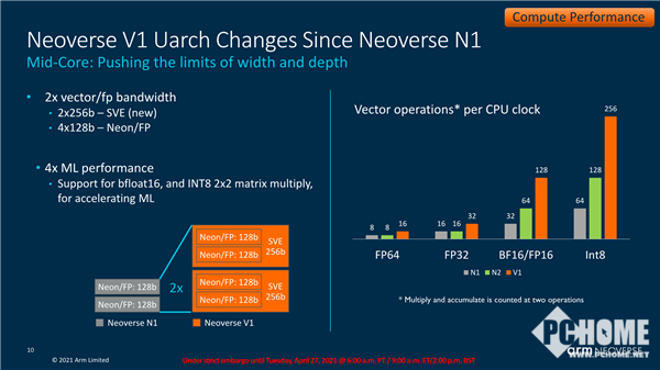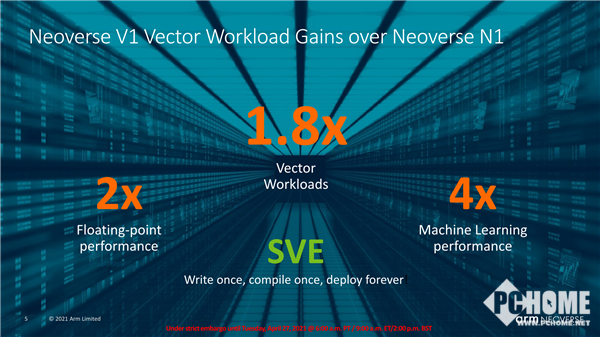 相比于N1,作为Arm强调性能优先的新型计算系列的第一个平台,V1带来了50%的性能提升、1.8倍的矢量工作负载优化、4倍的机器学习工作负载优化。