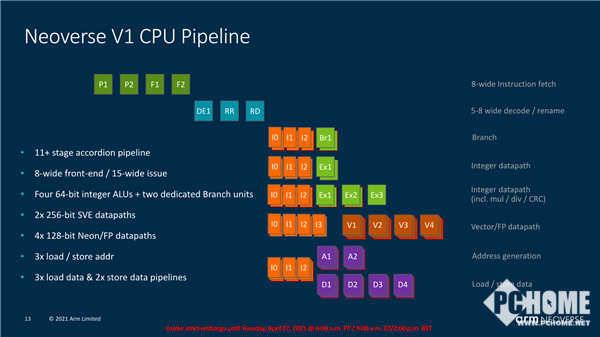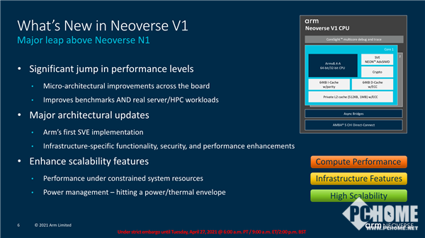 Arm V1平台仍然基于Armv8.4-A CPU指令集,不过整体架构、模块组成和基于Armv9指令集的非常类似,有诸多相通之处,同时也有全方位的微架构改进,针对基准测试、服务器/高性能计算工作负载的全面增强,当然也不会不计代价地拉高功耗,同样在电源、功耗、发热管理方面做了强化。