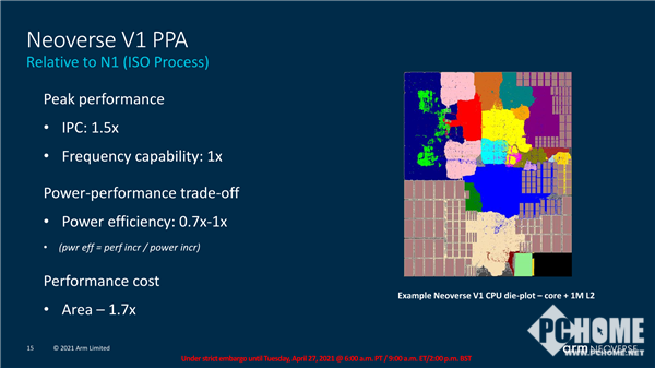 相比于N1,作为Arm强调性能优先的新型计算系列的第一个平台,V1带来了50%的性能提升、1.8倍的矢量工作负载优化、4倍的机器学习工作负载优化,可以灵活地为高度依赖CPU性能、带宽的应用构建强大的计算能力,SoC设计也非常灵活。